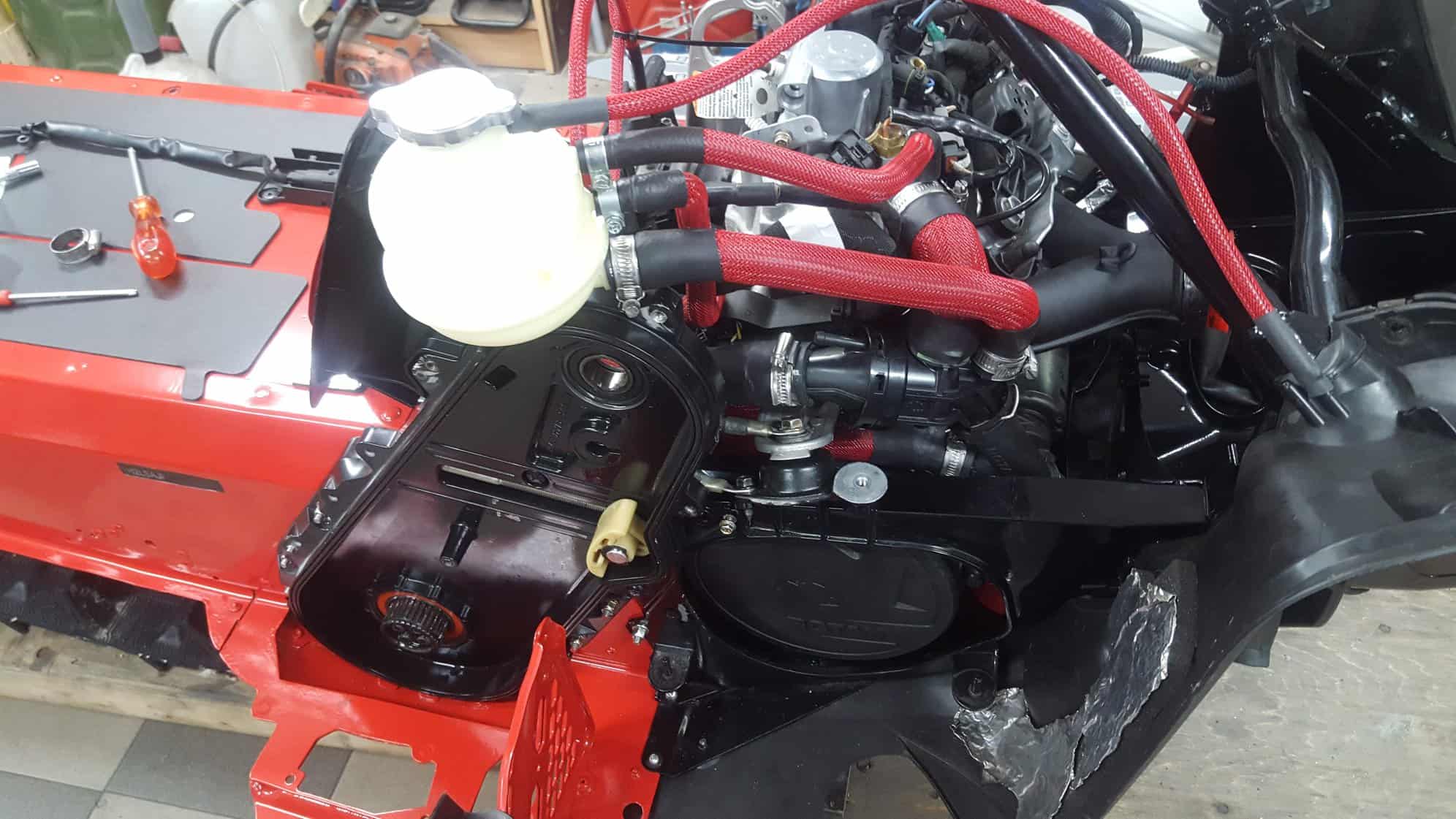 Nu då jag har fått tillbaka alla rödlackerade delar från pulverlacken så har monteringen kunnat börja på riktigt. Motorn var ju färdigpreppad så den var bara att lyfta i och det gick smidigt då jag tillverkat mitt egna ”lyftverktyg”. Efter att motorn var monterad var det dags att fixa med lite kylarslangar som skulle få samma röda ”snakeskin” som övriga slangar.
