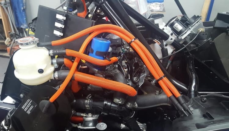 Så motor och allt runt den har jag börjat montera. Lite småfix runt den har jag gjort som tex “snakeskin” på vissa kablar och kylslangar. Det är för både extra nötningsskydd och en utseendefråga.