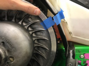 Börja med att göra rent variatorerna, gärna med hjälp av tryckluft för att blåsa bort damm först. Om remmen fortfarande sitter kvar sedan förra säsongen tar du loss den nu. Gör rent variatorskivorna med någon typ av slipduk för att få bort gummirester. Rengör sedan skivorna med aceton eller någon typ av sprit. Inspektera remmen och återmontera om den är fin. Annars tar du den som reservrem och monterar en ny. Kontrollera remmens spänning enligt instruktionsboken.