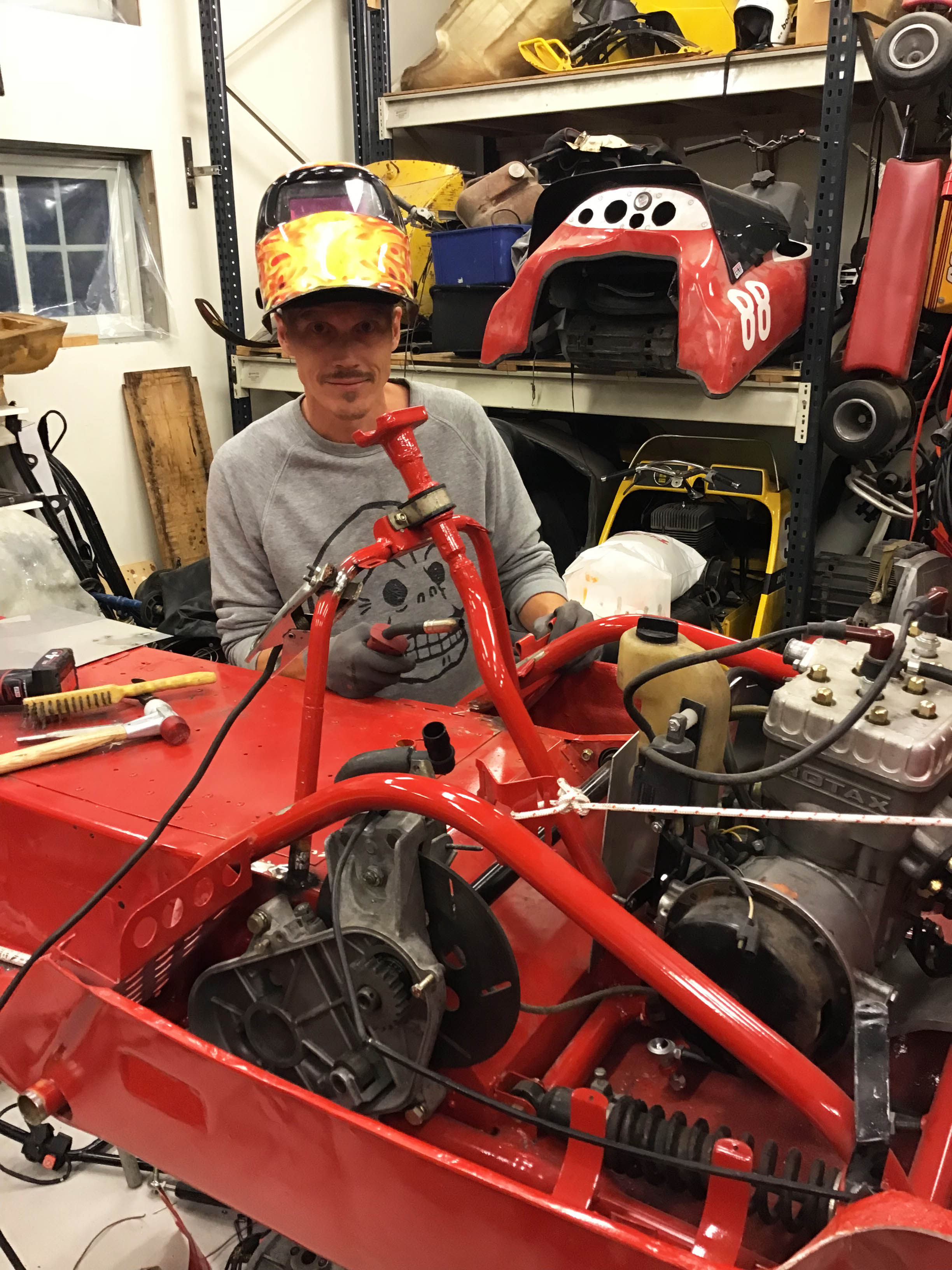 Det var under 2014-15 som vi insåg att vi hade så många reservdelar att det nog skulle vara möjligt att bygga en till maskin! Hur svårt kan det vara, det är väl bara rör och plåt? Inte så enkelt visade det sig. En grundförutsättning för att ett sådant här bygge är att man antingen har ritningarna eller en till skoter att mäta och kolla på, vilket vi ju hade. Sedan behövs minst en vanlig MX som reservdelsmaskin att plocka saker som skidor, styre och en massa annat från. Många av delarna behövde modifieras men hellre det än att till exempel bygga skidor från scratch!